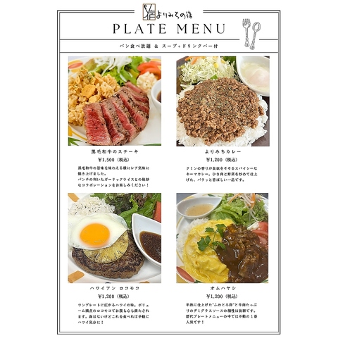 人気のおかずをワンプレートで楽しめて、パン食べ放題+スープ&ドリンクバー付きのお得なセットです。