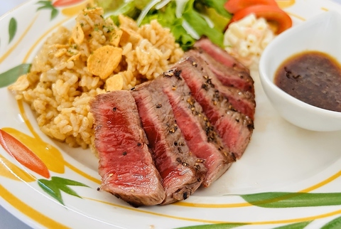 中津川産ひのき牛を使った、地産地消のステーキプレート。レア気味に焼き上げ、肉の旨味を存分に楽しめるジューシーな味わい。ガーリックライスが付いているのに、パンは食べ放題!さらにスープ&ドリンクバー付きのお得なセットです。
