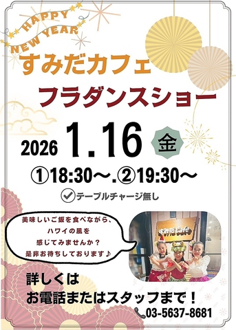 2026.1.16に店内にてフラダンスショーを開催します。(17:30と18:30)特別なチャージはありません。