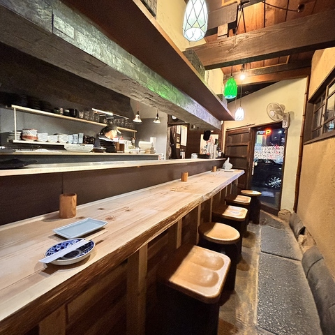古民家をイメージして造られた内装は温かみのある心地よい空間。雰囲気のあるカウンター席でごゆっくりとお食事をお楽しみください。