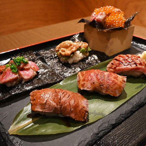 肉寿司・ミニうどん・小鉢がついたお気軽に肉寿司を楽しめるランチです。(肉寿司:赤身/ローストビーフ/選べる一貫)★選べる一貫・黒毛和牛大トロ・NIKURA(いくらこぼれ)・ねぎとろ(手巻き)・TERIYAKI(手巻き)★選べるうどんミニうどん・ミニわかめうどん