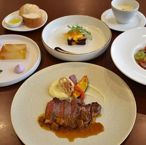 月替わりのフルコースはじめの一皿、スープ、前菜、パスタ、お魚料理、お肉料理、デザート、パン、デザート、コーヒーまたは荒野