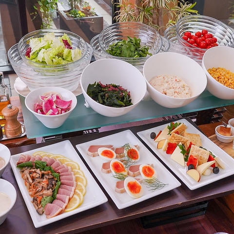選べるメイン(パスタ、リゾット、お魚、お肉)サイドブッフェ(サラダバー、冷前菜、温前菜、スープ、デザート)パンドリンクバー※スイーツフェア開催期間中はデザートは一皿になります。
