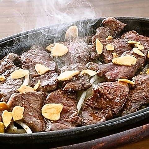 旨味がギュッとつまった牛サガリのカットステーキ!100g~450g(1ポンド)までご用意しております!アツアツの鉄板でご提供するジューシーなサガリステーキをご賞味ください!