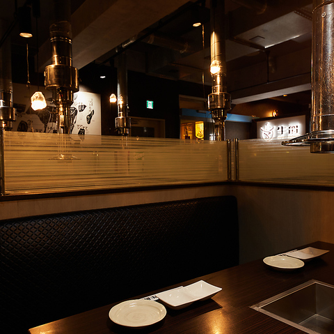 温かみのある間接照明とダークトーンの壁が広がる、落ち着いた雰囲気のテーブル席。ゆったり配置された座席で周囲を気にせず会話を楽しめ、デートや同僚との食事にも最適です。無煙ロースター完備で煙を気にせず快適に焼肉を堪能可能。大切なひとと過ごす時間をやさしく包み込む、居心地の良い焼肉空間です。