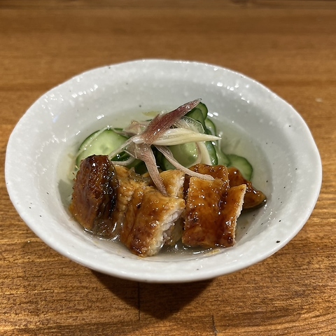 うなぎと肝をネギと出汁割りのポン酢でサッパリお召し上がり下さい。当店で出来たメニューです。