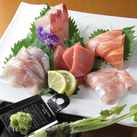 《一品居酒屋看板メニュー》静岡県産地魚を中心にしたお刺身盛り合わせ5種はいかがでしょうか。お酒との相性◎新しい虎鉄の看板メニューをぜひご堪能下さい。その日一番新鮮なものをオススメで提供しております。