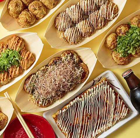 たこ焼きやお好み焼きといった「こなもん」に加え、お酒が進む一品料理や居酒屋メニューも充実しています。昼は麺類や定食などのお得なランチメニュー、夜は飲み放題付きのコースまで幅広くご用意。様々なシーンでご利用いただけるよう、バラエティ豊かなメニューを取り揃えています。