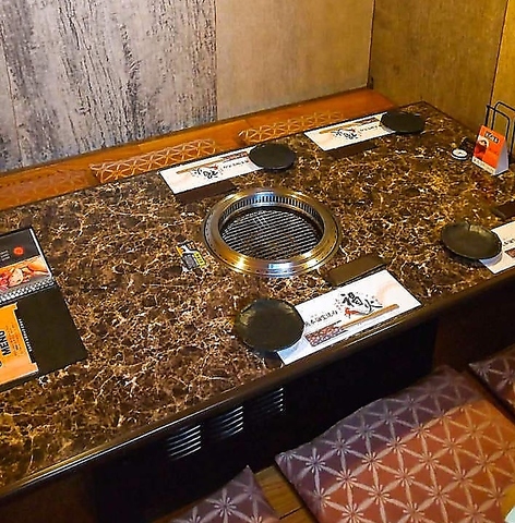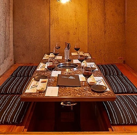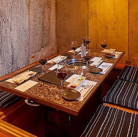 壁・扉あり◎周囲を気にせず、ゆったりと和やかにお食事を楽しめる掘りごたつの完全個室をご用意しております。お仕事帰りのご会食や気の合う仲間たちとの語らいの時間もぴったり。落ち着いた雰囲気の中で味わう焼肉は、特別な美味しさ!心地よい空間で、時間を忘れてくつろぎながら極上のお肉をお楽しみください。