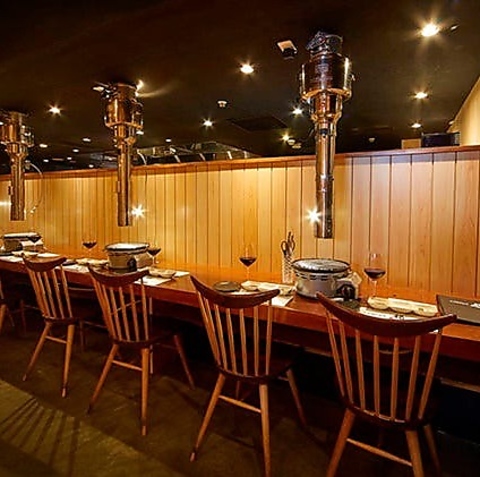【カウンター席/8名様】おひとり様焼肉やカジュアルデートに◎おひとり様のランチにもお気軽にどうぞ!明るい木目調の落ち着いた雰囲気のカウンター席で、ゆっくりと焼肉をお楽しみいただけます。横並びで過ごすデートにもおすすめ。1席ごとの間隔を広めに確保しているため、隣を気にせず快適にご利用いただけます。