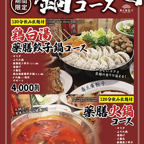 冬といえば鍋!!今年の鍋は白湯鍋と火鍋をご用意!!心も体も温まる忘年会コースは120分飲み放題付!!