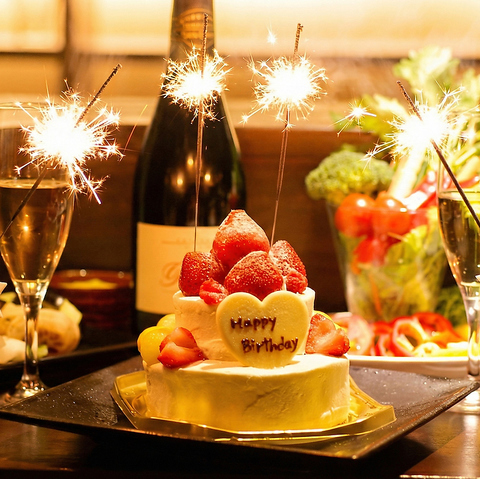 主役へのメッセージを添えた演出で、思い出に残るひとときを演出します。落ち着いた店内で食事を楽しみながら、さりげなくお祝いできるため、友人同士はもちろん、デートや大切な方とのお祝いにもおすすめです。事前のご相談で内容の調整も可能です。