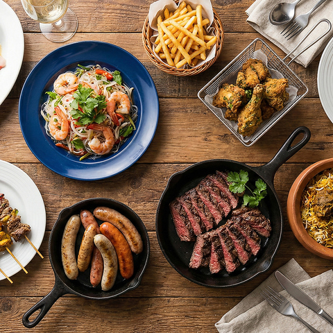生春巻き・鮮魚のカルパッチョ・チーズ盛り合わせの前菜から始まり、ローストビーフサラダや小海老のアヒージョで食欲を高める贅沢な構成。名物モモやチキンティッカ、シシカバブに加え、牛ハラミとラムチョップのグリルを楽しめる肉料理充実の内容です。〆はパスタ・肉ビリヤニ・チーズナンから選択可能。