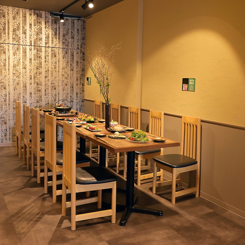 和の雰囲気を大切にしたテーブル席をご用意しております。最大28席までご利用いただける広々とした空間で、心地よいひとときをお過ごしいただけます。ご家族や友人同士、会社の同僚との集まりにぴったりなテーブル席は、和の風情を感じながら、料理や串焼きを楽しむことができます。また、一枚板のカウンター席もあります◎