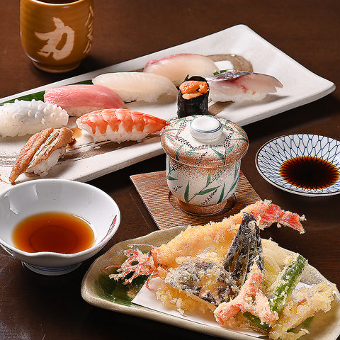 寿司や刺身などいろいろ楽しみたい方におすすめです!うにや中とろなどのにぎり九貫、刺身、やりいかゲソの天婦羅、茶わん蒸し、吸物のフルコースをお楽しみいただけます。ランチ、ディナーともにご注文可能です。新鮮な海の幸を存分にお楽しみください。