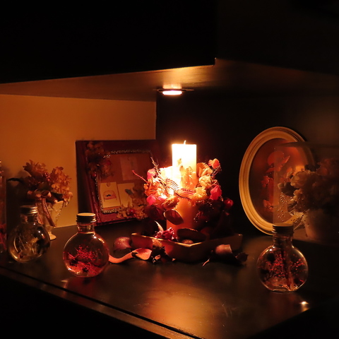 プリザーブドフラワーと繊細なハーバリウムが彩る、華やかで心落ち着く空間。4人掛けのテーブル席は、友人同士やご家族との会話が弾む特等席です。優しい自然の美しさに包まれながら、ゆったりとした時間をお過ごしください。