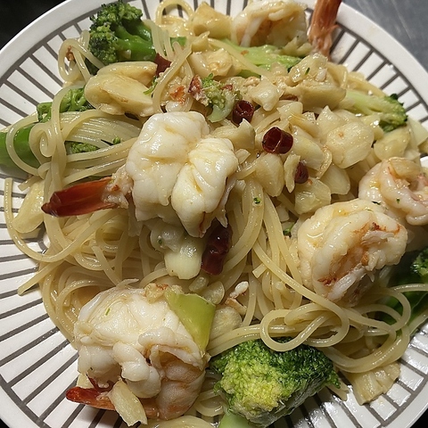 ベースのペペロンチーノに具材をたっぷりトッピングfrきます。+300円(税込)あさり +300円(税込)シーフードミックス※推奨ドリンク ビール、白ワイン
