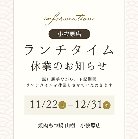11月22日~年内の間、ランチタイムの営業を一時休業とさせていただきます。