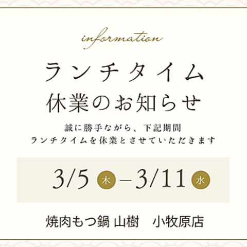 いつもご来店ありがとうございます。誠に勝手ながら、3月5日~11日の間、楽天通販事業の多忙に伴い、ランチ営業を一時休業させていただきます。ご来店予定の皆様にはご不便をおかけしますが、何卒ご理解のほどよろしくお願いいたします。