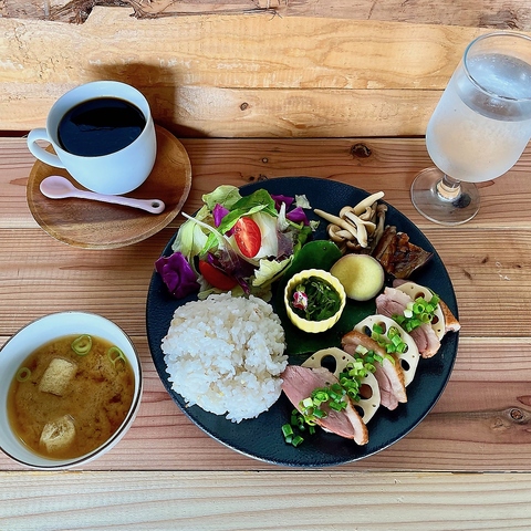 合鴨の燻製と蓮根の和風仕立てを一緒にお召し上がりいただけます。ワンプレートには、メインの合鴨の燻製と蓮根の和風仕立て、サラダ、お総菜、国産もち麦お米とお味噌汁のセットです。
