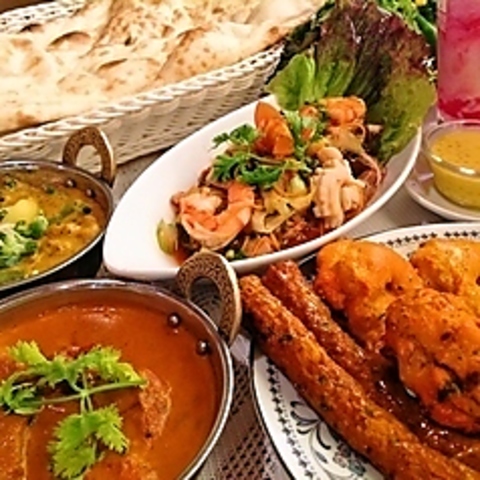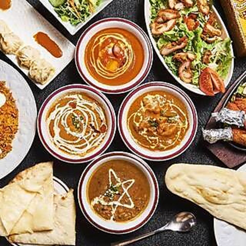 本格インド料理を存分に味わえるコース料理では、最後のナンとライスが食べ放題になる嬉しいサービスも。ジューシーな肉料理から、新鮮な野菜をたっぷり使ったサラダ、生春巻きといったアジアンメニューまで幅広くお楽しみいただけます。ボリュームと美味しさを兼ね備えた内容で、お腹も心も満たされること間違いなしです。