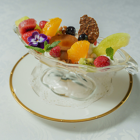 クラシカルなグラスの器に、プリンとたっぷりのフルーツを贅沢に盛り付けました。懐かしくも新しい、写真映え抜群の一皿。
