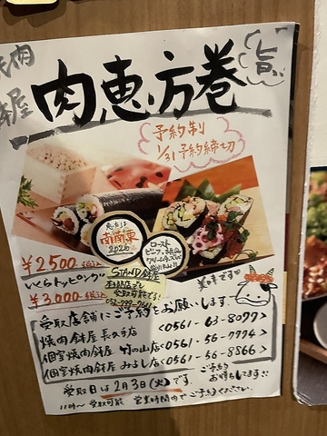 今年の節分は2月3日(火)♪焼肉鉢屋では、ローストビーフをメインに、きゅうりやクリームチーズなど盛り沢山の具材を巻いた、焼肉店ならではの「肉恵方巻」をご用意!お一人様で食べきれないほどの大きさなので、カットして皆様でお楽しみくださいね!