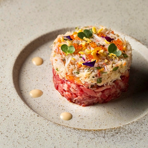 「黒毛和牛とずわい蟹のユッケ」 ずわい蟹は味が濃くジューシーで、黒毛和牛にも負けない旨味を持ちます。