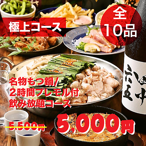 天神名物「謹製 もつ鍋」がメインの極上コース♪人気のプレモル付飲み放題!もつ鍋はこだわりのあごだし(トビウオ)に昆布やしいたけ、野菜からスープを仕込んだ特製スープをベースに、醤油、オリジナル、味噌からお好みの出汁を選べます。国産牛もつを使用しているため臭みがなくぷりぷりの食感♪ぜひご賞味ください!
