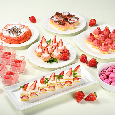 苺たっぷりのデザートコーナーの主役。ふんわりスポンジに、なめらかな生クリームとみずみずしい苺を重ねました。苺の甘酸っぱさが引き立つスイーツで春の訪れを感じる特別なひとときを。