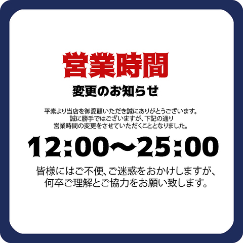 月~日、祝日、祝前日: 12:00~翌1:00 (料理L.O. 翌0:30 ドリンクL.O. 翌0:30) ※お昼の宴会も承ります。詳細はお電話にてお問合せ下さい。 |