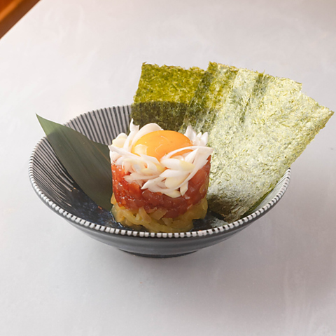 刻んだまぐろの旨みに、たくあんのコリッとした食感が心地よいとろたくユッケ。濃厚な卵黄と特製ダレがまぐろに絡み、ひと口で贅沢なコクが広がります。香ばしい海苔で巻けば、さらに旨みが倍増。お酒との相性も抜群で、最初の一品にも〆にも人気の一皿です。