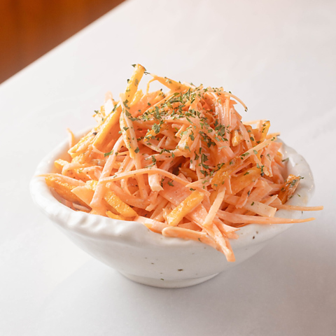 シャキシャキの細切り人参に、ピリ辛のカラムーチョ風味をまとわせたやみつきおつまみ。クリーミーなソースが辛さを包み、噛むほどに旨みが広がります。お酒との相性も抜群で、最初の一品にも小腹満たしにもぴったり。