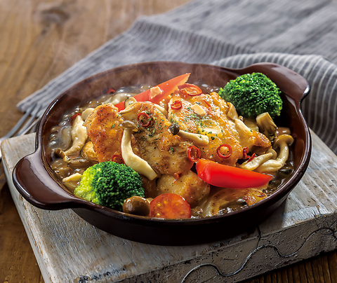 にんにく(ガーリックオイル含む)を使用しています。チキンときのこ、野菜がたっぷり。パンと相性抜群のアヒージョ。