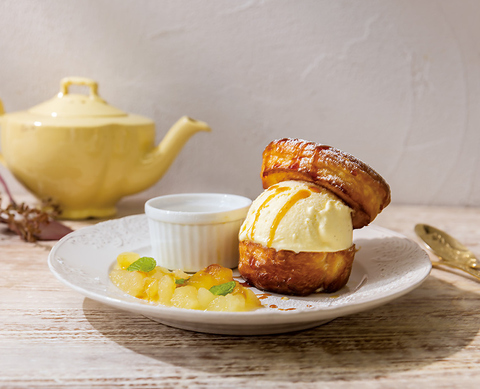 外はカリカリ、中はサクサクに焼き上げたクイニーアマンにバニラアイスを挟みました。リンゴジャムとカラメルのビターなソースが相性抜群。ミルククリームはお好みで。