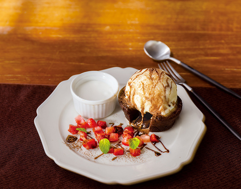 手作りチョコケーキから濃厚ソースがとろーり。ミルククリームや冷たいバニラアイスと絡めて召し上がれ。
