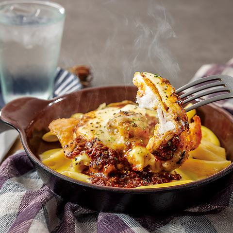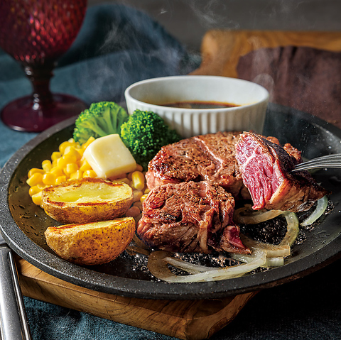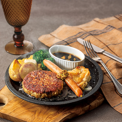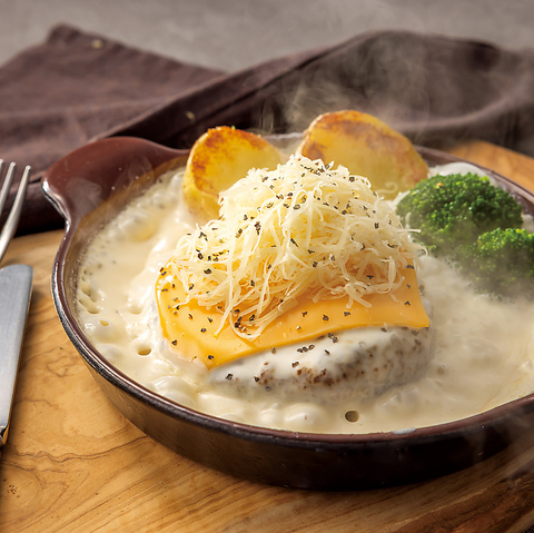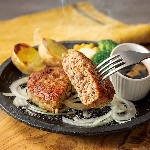 口の中で溶け出す旨味!熱々の鉄板に乗せてご提供。 切った瞬間に肉汁がジュワ~ッ!と溢れ出し、食欲をそそる香りが立ち上ります。 特製のガーリック醤油ソースと、甘みを引き出したあめ色玉ねぎを混ぜ込んだハンバーグが、ガツンと肉の旨味を引き立てます。 今日はお肉を心ゆくまで楽しみたい!という日にどうぞ♪