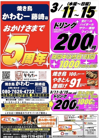 3/11~15(水曜~日曜)生ビール/ハイボール/サワー・焼酎/ワイン等220円(税込)、飲み放題1時間1100円(税込)