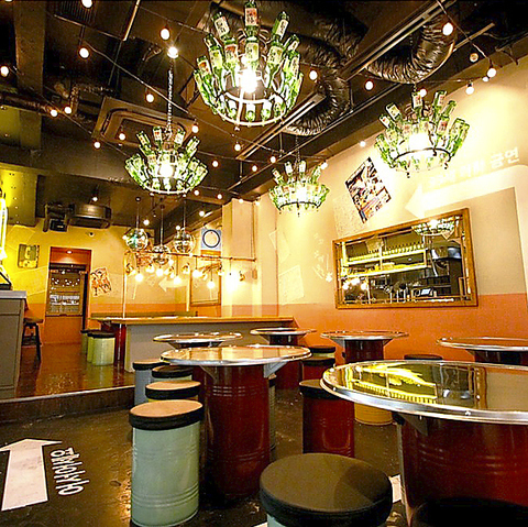 【京橋駅から徒歩4分】非日常感たっぷりの“ネオ韓国”空間。キラキラしたネオン管やミラーボールが輝き、韓国焼酎の瓶を並べたシャンデリア風照明とドラム缶テーブル、派手めなインテリアが視覚を楽しませてくれます。飲み放題付コースも充実しているため、各種宴会にオススメです!