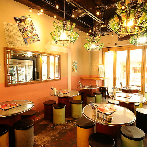 【京橋駅から徒歩4分】非日常感たっぷりの“ネオ韓国”空間。キラキラしたネオン管やミラーボールが輝き、韓国焼酎の瓶を並べたシャンデリア風照明とドラム缶テーブル、派手めなインテリアが視覚を楽しませてくれます。飲み放題付コースも充実しているため、各種宴会にオススメです!