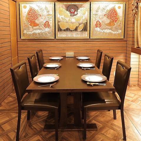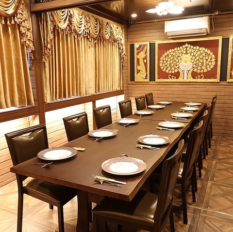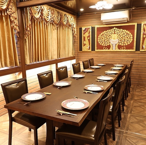 団体様向けの完全個室は7~14名様でご利用いただけます。広々とした空間で、タイの美術品に囲まれながら、周りを気にせずお食事と会話をお楽しみいただけます。コース料理と飲み放題で、皆様の大切なひとときを演出します。