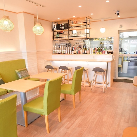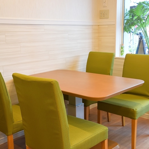 シンプルで居心地の良いテーブル席をご用意しました。壁の木目調と椅子の緑が、落ち着いた癒しの空間を演出します。お一人様でも、ご友人とのランチでも、気軽にご利用いただけます。
