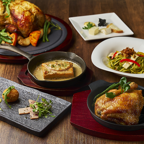5種類のハーブと野菜に24時間以上漬け込み、料理長独自に温度調整を施した専用のロティサリーグリルで丁寧にゆっくりと焼き上げました。パリっとする皮の表面とやわらかくジューシーな鶏料理メインのパーティープランをお楽しみください。