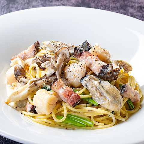 プリっとしたカキとうま味たっぷりのホタテをベーコンの香ばしさ、チーズソースのコクで引き立てます。キノコやほうれん草入りの濃厚なクリームソースに仕上がっています。