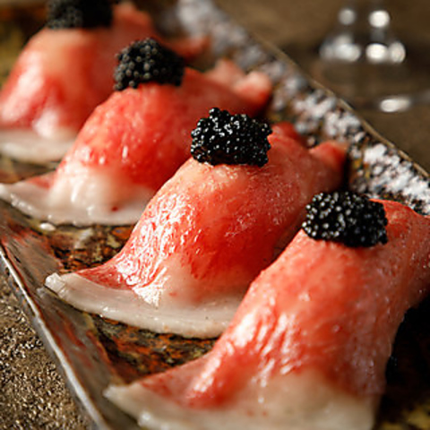 恵比寿でカジュアル&リーズナブルに美味しい肉とお酒を楽しみたい時にはぜひ当店へ!「炙り肉寿司featキャビア」は、黒毛和牛A5ランクの上品な甘みのサーロインにキャビアをトッピングした、まさに贅の極み!また、軽く炙った肉に卵を絡めていただく「サーロイン焼きすき」や、「ともさんかく」「しんしん」など希少部位もご用意しております。