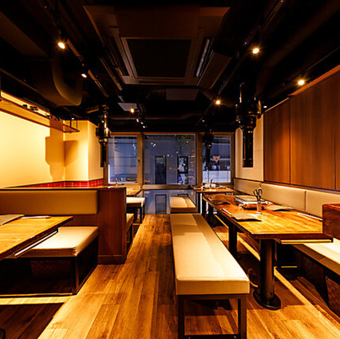 2024年に改装された1階席です。カジュアルさと高級感が絶妙に融合した魅力的な空間になっております。広々としたテーブル席とカウンター席が並び、友人や家族との食事を楽しむのにぴったりです。ここでの食事は、まるで非日常の世界にいるかのような特別感を感じることが出来ます。心ゆくまで焼肉を楽しむ贅沢な時間をお過ごしください。