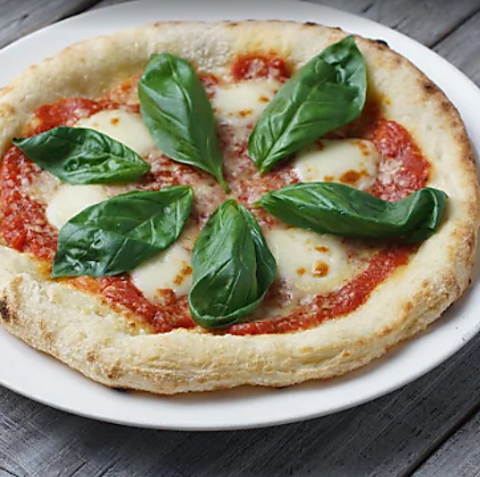 トマトソース、モッツァレラ、バジルを使ったシンプルなピザ