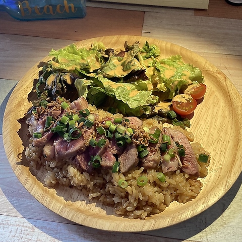 湘南の名店の味をそのまま受け継いだガーリックライスに道産牛のステーキをのせた当店自慢のメニュー。サラダも付いた1プレートディッシュです。