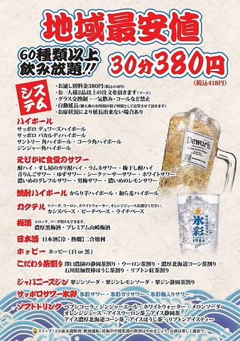 【地域最安値】60種類以上飲み放題!!激安の30分380円(税込418円)