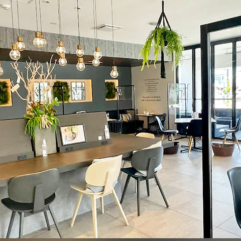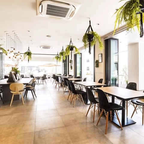 大きな窓から光が差し込む店内は、開放感のある雰囲気が特徴です。テーブル席やソファー席があり、少人数から大人数まで幅広い利用に対応。女子会やご家族でのお食事はもちろん、リモートワークや作業利用にもおすすめ。明るさと広さを兼ね備えた空間で、集中とリフレッシュを両立できる心地よい時間を過ごせます。